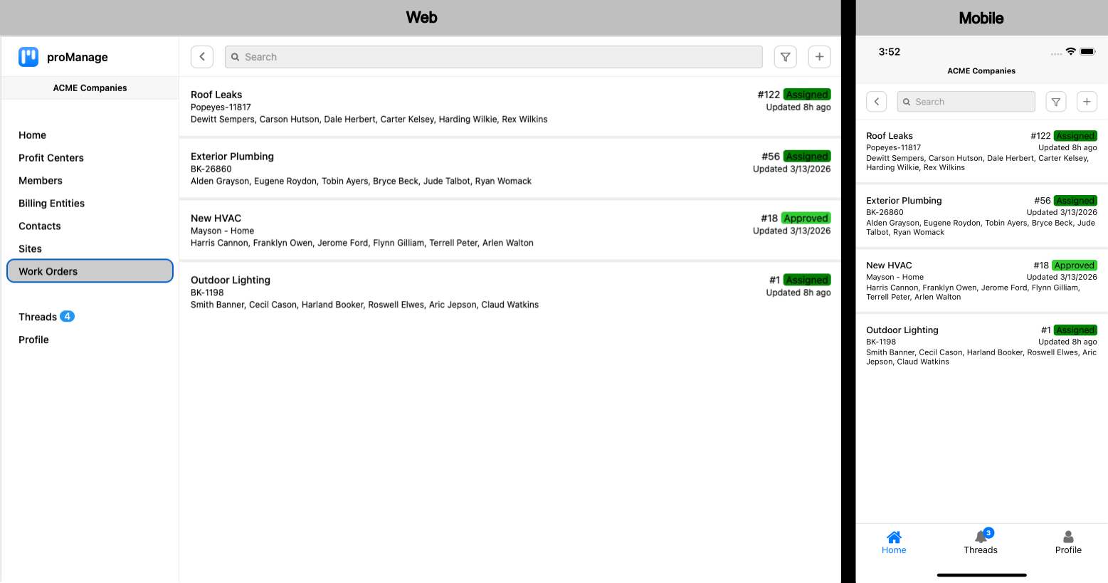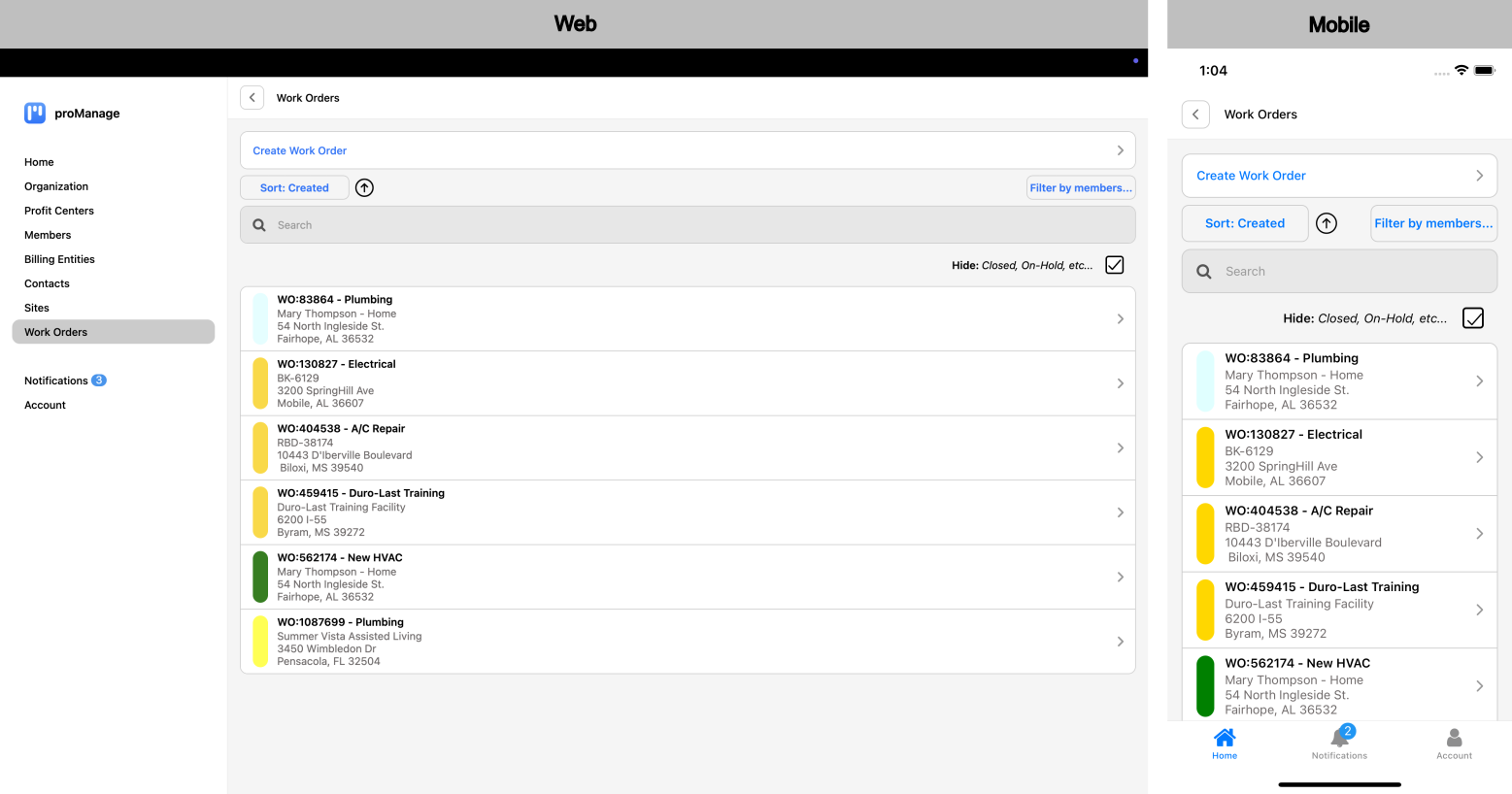 The Work Orders screen provides a list of all work orders for which each specific user has access. Owners and Admins have access to all work orders. Project Managers, Superintendents, and Technicians only see work orders for which they have been added (see Personnel later in this section).