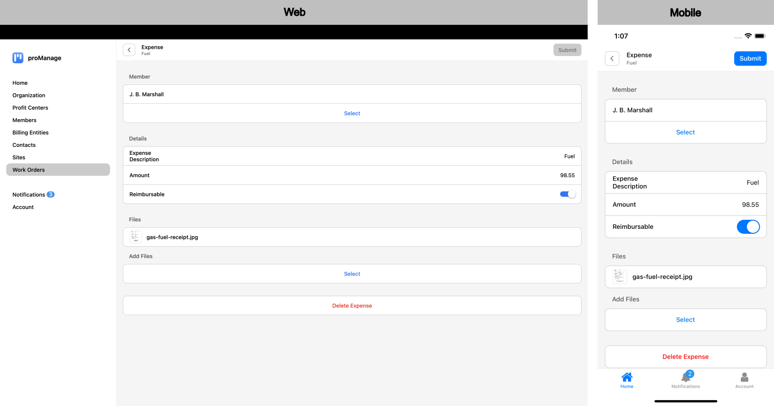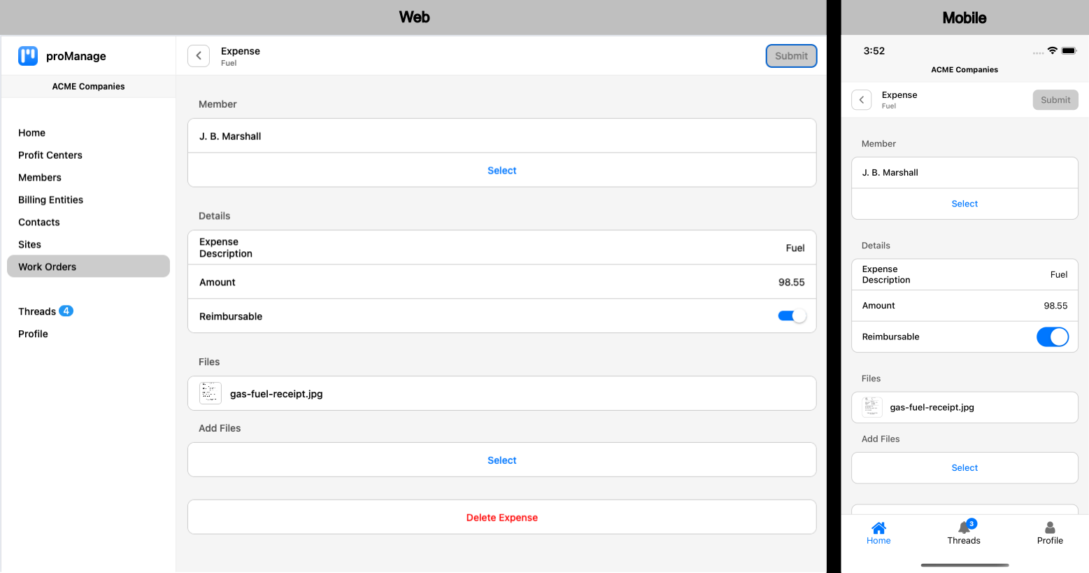 The user simply enters the details to the expense and uploads an image of the reciept. If the employee needs to be reimburse for the expense, they simply slide the "Reimbursable switch" and the expense will be included in the payroll run for the week the expense was incuured.