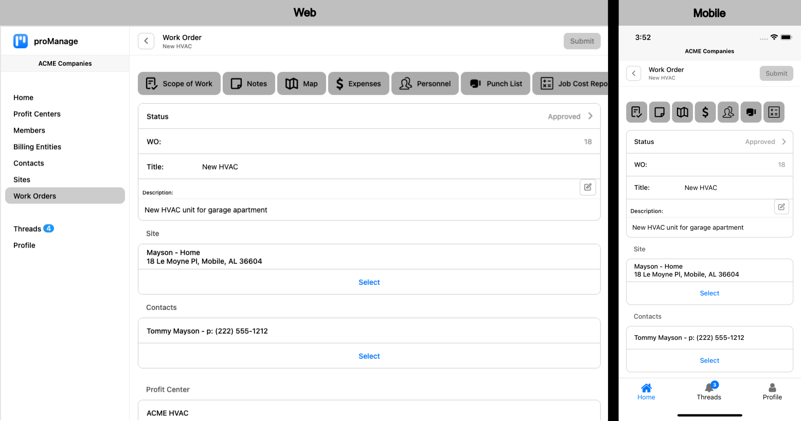 Contacts - site contacts for the work order - this should be the customer, whether they are the owner of the site, or a specified contact for the owner, which could also be a contractor for the site.